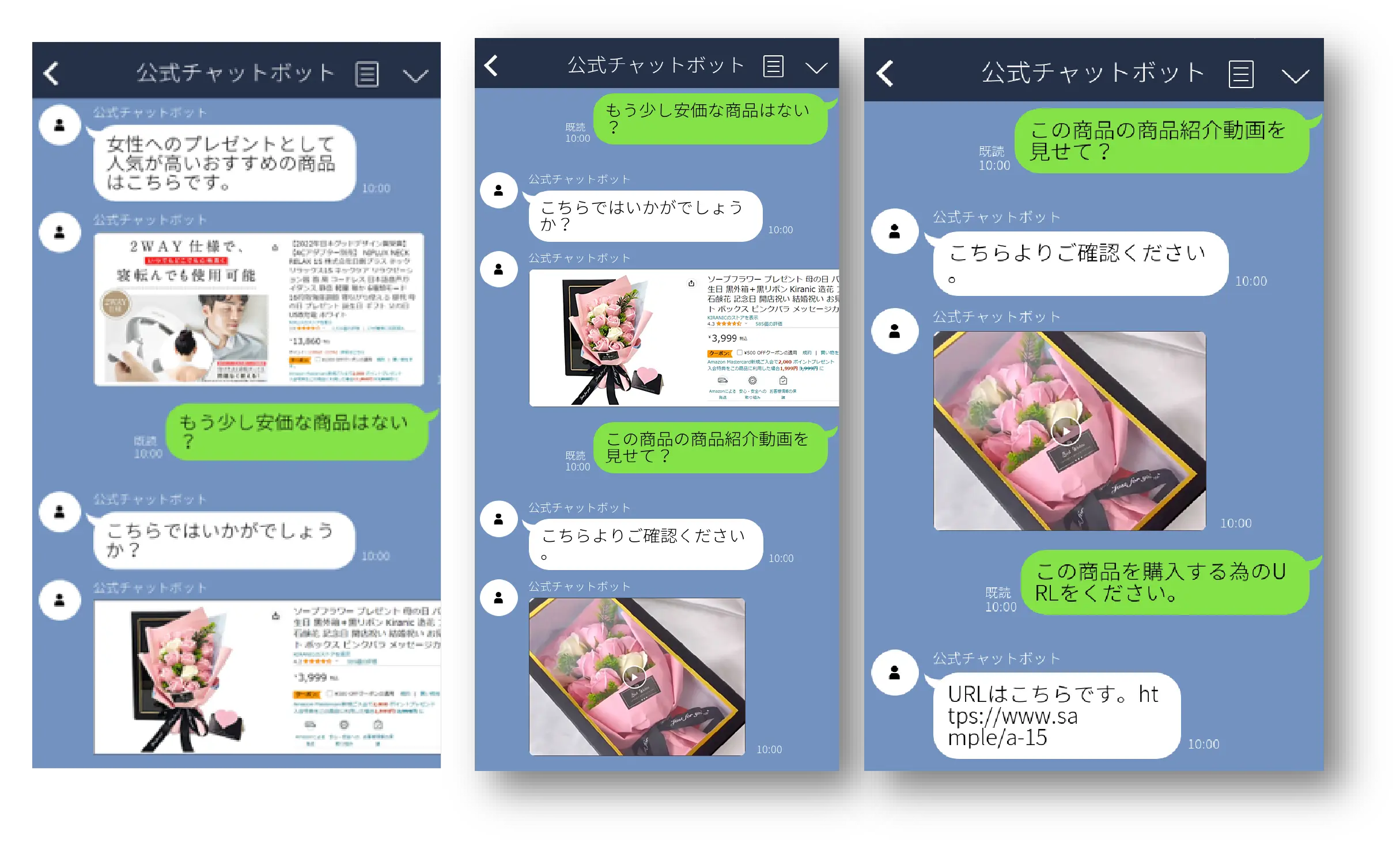 - 開発した自社専用チャットボットは、質問・相談した内容に対して画像・動画・URLを付属しメッセージへの返答を行う事が可能です。